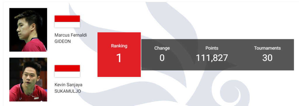 男雙(MD):Marcus Fernaldi GIDEON、Kevin Sanjaya SUKAMULJO(印尼)