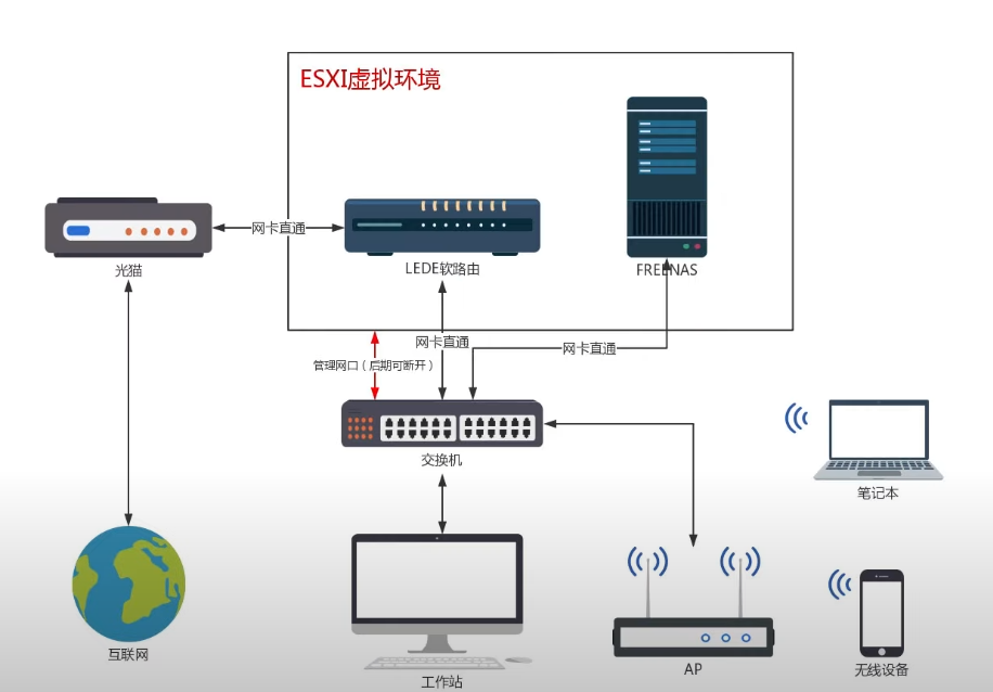 對於多硬盤的設備,使用NAS系統來管理,可以直接直通SATA控制器或硬盤。其實文件共享如果需求不高也可以使用一些簡單的FTP、SMB、WEBDEV之類的協議,因為我購入的設備硬盤位是不太夠用的哈哈。