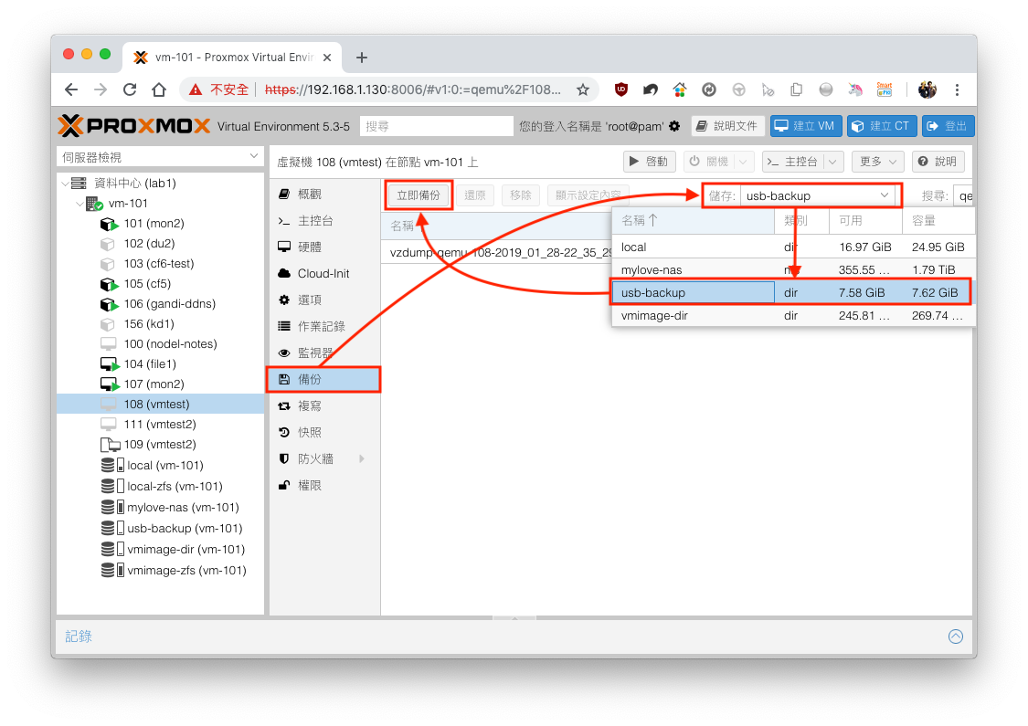 記得在備份時,要在右方的下拉選單選取掛載進來的 usb-backup,這樣才會備份到正確的目的地。